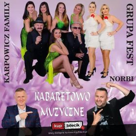 bilety: Norbi karierę rozpoczął w 1997 roku. Pierwszy singiel KOBIETY SĄ GORĄCE z debiutanckiej płyty SAMERTAJM od razu stał się hitem. Kolejne single SAMERTAJM(duet z Natalią Kukulską),BALLADA STUDENCKA czy POKRĘCIO SIĘ W GŁOWIE udowodniły że debiut Norbiego okazał się trafiony, stąd najważniejsza nagroda polskiej branży muzycznej FRYDERYK za najlepszą płytę taneczną, oraz DANCE MUSIC AWARDS przyznawaną przez DJ-ów, a także PLAYBOX, nagroda dziennikarzy radiowych. Rok 1998 to kolejne sukcesy. Singiel NIE ZACZEPIAJ MNIE z drugiej płyty NORBI2 spowodował że Norbi zaśpiewał w Opolu i poprowadził jeden z koncertów tego zacnego festiwalu. Jesieni tego samego roku ukazał się utwór ROZKOŁYSZ SIĘ, a pod koniec roku na koncie artysty pojawia się kolejny PLAYBOX. W 1999 Norbi nagrywa kolejny album NORBI2000, na którym znalazły się eksperymentalne duety. Gwiazda RMF FM Marcin Jędrych, Szef muzyczny radia ZET i perkusista POPAŻONYCH KAWĄ Wojtek Jagielski, gwiazdy sportu Przemek Saleta, Tomek Iwan i Pioterk Świerczewski, gwiazdy TVP Maciek Orłoś i Marek Sierocki i jedyna gwiazda śpiewająca, ale za to jaka…Krzysztof Krawczyk. Czas na XXI wiek. Pracował w olsztyńskim oddziale Telewizji Polskiej i w radiu Wa-Ma. Prowadził teleturnieje emitowane w TVN i TVN Gra: Fabryka gry, No to gramy! i Salon gier[1]. W latach 2018-2024 współpracował z TVP jako prowadzący teleturnieje: Jaka to melodia? (2018)[12] i Koło Fortuny (2019-2024)[13]. Od października do 15 listopada 2024 współprowadził program śniadaniowy w internetowej telewizji Silver TV, dla której od października 2024 prowadzi także teleturniej wiedzowy Turniej pokoleń[14], a od 18 listopada - magazyn Na dobry wieczór. Karpowicz Family na scenie muzycznej pojawiła się jesienią 2000 roku. Jej założycielem i twórcą jest lider zespołu a zarazem wokalista Zbyszek Karpowicz. Setki koncertów w kraju i za granicą mają wpływ na ich popularność. Muzyka i taniec tej barwnej grupy charakteryzuje się temperamentem i melodyjnością a teksty nie stanowią skomplikowanych do przemyśleń wersów. Program pełen jest kolorów i radości. Swymi koncertami aby nie powiedzieć małymi spektaklami muzycznymi niosą uśmiech i zadowolenie swym wielbicielom. Ich dorobek artystyczny to dziesięć wydanych płyt CD: "Westchnienie", "Radość", "Viva Mexico", "Kolędy", "Już taka jesteś", "Droga do Ciebie", na której znajduje się największy ich przebój "A kuku", "Moje przeznaczenie", "Nektar Szczęścia", "Gdy mamy siebie" oraz podwójny album "THE BEST OF", na którym znajduje się 41 największych przebojów.. Ich wiedeoteka to 38 nagranych teledysków. Obecnie scenę tego zespołu zdobią: Agnieszka Doliszniak, Ania Karpowicz - Socha, Karina Morkis, Monika Patynek, Barbara Chodun, Helmut Gaweł no i Zbyszek Karpowicz. Nieść ludziom radość i nadzieję - to główne motto zespołu Karpowicz Family. Bilety do nabycia na: KupBilecik.plGrupa Fest i Norbi artyści: Grupa Fest, NorbiNorbi, właśc. Norbert Dudziuk - polski piosenkarz oraz prezenter telewizyjny i radiowy. Grupa Fest to kabaretowy zespół muzyczny z Gliwic założony w 2008 roku, przez Jakuba Tomaszewskiego. Wykonuje piosenki w stylu szlagierowym oraz tanecznym, sporo utworów śpiewanych jest w gwarze śląskiej. Bilety do nabycia na: KupBilecik.pl |