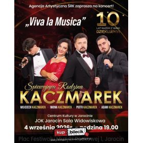 bilety: "Viva La Musica" to zupełnie nowy koncert jedynej w Polsce rodziny śpiewającej muzykę klasyczną. W wykonaniu Śpiewającej Rodziny Kaczmarek usłyszycie państwo tym razem najpiękniejsze melodie z operetki min. Wesołej wdówki, Hrabiny Marizy, Księżniczki Czardasza, czy Guditty, przeboje z musicali min: Skrzypka na dachu, My fair lady czy Upiora w operze, a także piękne standardy muzyki rozrywkowej, piosenki z repertuaru Franka Sinatry Elvisa Presleya, Poula Anki czy Luisa Armstronga. Śpiewająca Rodzina Kaczmarków artyści: Iwona Kaczmarek, Piotr Kaczmarek, Wojciech Kaczmarek, Adam KaczmarekŚpiewająca Rodzina Kaczmarków - dobrze znana w całej Polsce. Koncertują razem od 4 lat. Adam i Wojtek dali się poznać szerokiej publiczności po występie w programie Mam talent, odnosząc tamże ogromny sukces. Adam Karczmarek to również gość Festiwalu Piosenki Krajowej w Opolu. Bilety do nabycia na: KupBilecik.pl |